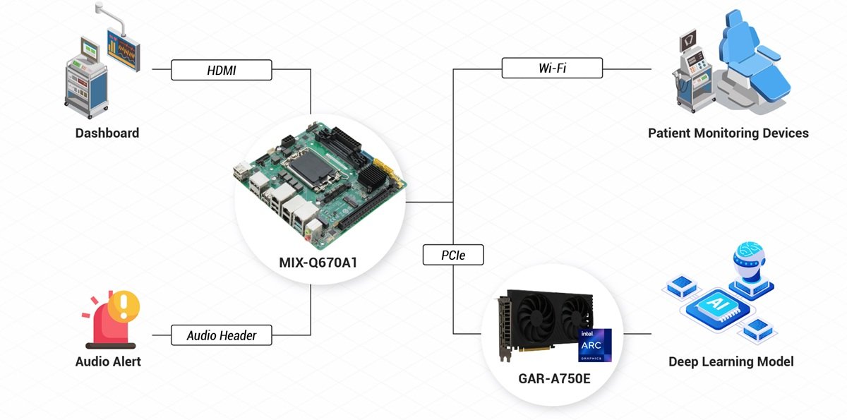 A further reason this CPU choice suited the application was because the AI inference and complex data analysis tasks required for the ICU monitoring station were handled by the Intel® Arc™ A750E GPU-powered GAR-A750E. Installed via the MIX-Q670A1's 16-lane PCIe Gen 5 slot, the GAR-A750E's purpose was to accelerate AI inference, helped by Intel Deep Link Integration to act as a bridge between the CPU and GPU. This setup ensured that the compute and AI workloads of the application were distributed in the most efficient way, minimizing latency.