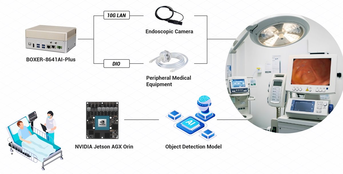While collecting image data through its connected endoscopic camera, the BOXER-8641AI-Plus Plus successfully executed the customer’s proprietary AI model with the help of its integrated NVIDIA® Jetson AGX Orin™ module. With up to 275 TOPs of AI performance and 64GB of LPDDR5 memory, the use of NVIDIA® Jetson AGX Orin™ module facilitated the extremely fast and precise execution of complex object detection and image classification algorithms. Such exceptional computational power subsequently allowed the BOXER-8641AI-Plus to process high-resolution colonoscopy video data in real time to identify polyps and other abnormalities with accuracy.