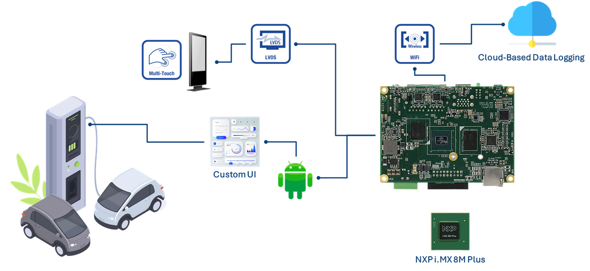 Firstly, it is important to highlight the technical suitability of the PICO-IMX8PL when it comes to the project. For one, the board is powered by the NXP i.MX 8M Plus platform, which incorporates a quad-core Arm® Cortex®-A53 processor with a Neural Processing Unit (NPU) operating at up to 2.3 TOPS. This provided the EV charging station with more than enough processing power to operate smoothly while maintaining a low power profile, as the board consumes just 14.8W at full load, on average. This made the PICO-IMX8PL not only an ideal platform for the power-efficient operation the customer sought, but also helped offset the typically greater power draw required when running applications on an Android™ OS, compared to lightweight operating systems like Linux.