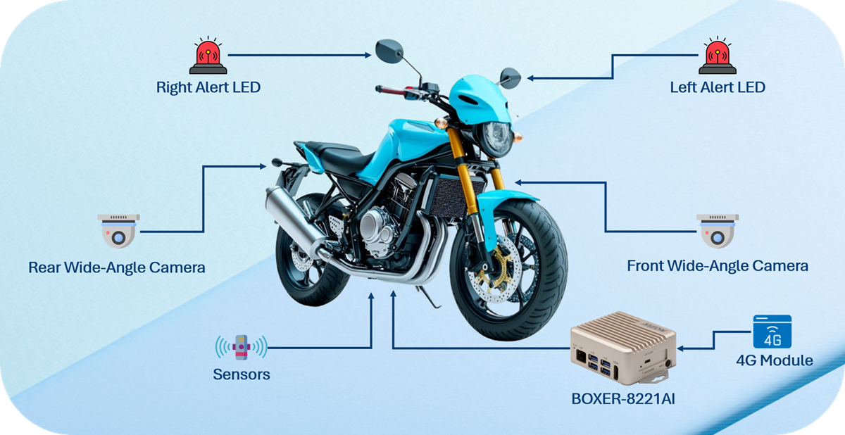 Using the video feed from wide-angle cameras, the BOXER-8221AI's integrated NVIDIA® Jetson Nano™ module could execute optimized deep learning models at the edge to identify imminent collision risks, unsafe distances, blind spots, and hazardous overtaking maneuvers in real time. When the BOXER-8221AI detected such an incident, a non-intrusive alert would be sent to the Rider Alert Unit (RAU), which consisted of two LED lights mounted either adjacent to the motorcycle’s wing mirrors or on its dashboard. A major benefit to such a setup is that, since the analysis took place entirely at the edge, hazards could be detected in real time, allowing notifications to be sent to the Advanced Rider Assistance System without the latency associated with cloud-based data processing.
