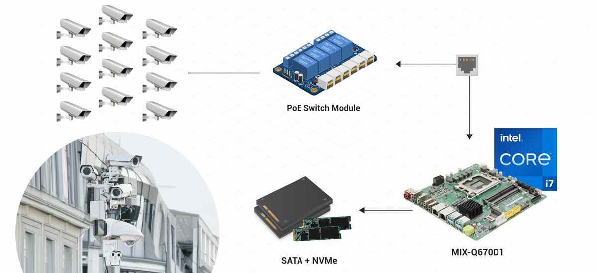 The MIX-Q670D1’s dual GbE LAN ports were critical to supporting the multiple IP cameras required to collect video data. To achieve this, each LAN port was connected to an 8-port internal PoE switch module integrated into the NVR system chassis, which in turn routed video stream data from their connected cameras to the MIX-Q670D1 for processing, analysis, and storage. This architecture allowed the NVR to remain relatively compact and self-contained, whereas installing a motherboard equipped with the same number of onboard PoE ports would mean substantially increasing the size of the chassis housing it, while also standardizing the number of cameras supported, limiting the customer’s options to develop multiple SKUs depending on the needs of different end users.