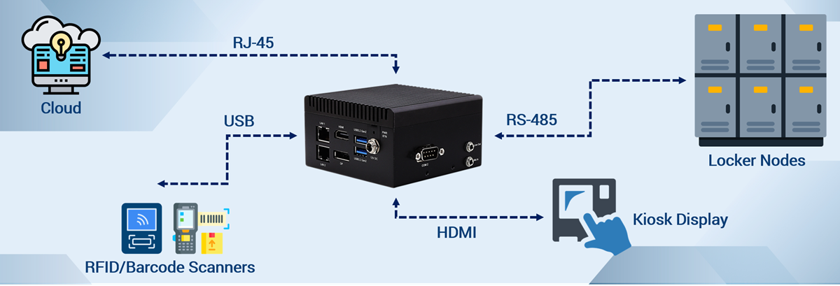 The key thing that set the UP Squared 7100 Edge apart from other choices was its multifaceted and broad selection of interfaces, especially given its small size. The customer’s existing smart locker infrastructure relied on RS-485 serial communication via COM port, and so the task of controlling the application’s locker hardware leveraged the UP Squared 7100 Edge’s dual COM ports. Via its RS-485 interface, the UP Squared 7100 Edge was able to support up to 32 locker nodes connected in daisy-chain topology. This allowed users to enter a code for a specific locker, at which point the UP Squared 7100 Edge could send the necessary command for the locker associated with that node to be unlocked, while also receiving confirmation that it had been closed, via the sensor installed in each locker.