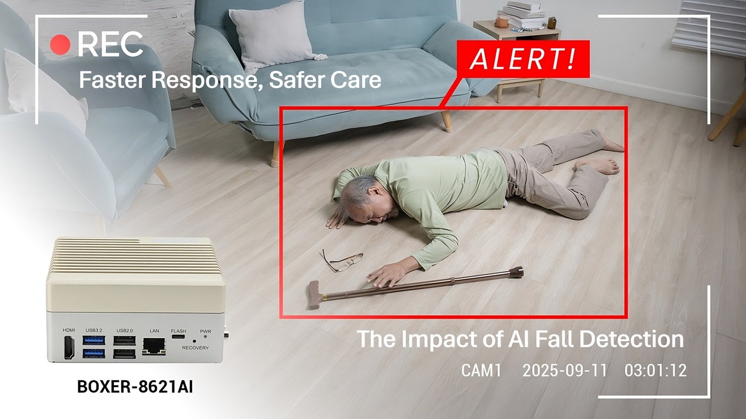 The BOXER-8621AI’s NVIDIA® Jetson Orin Nano™ module offered up to 67 TOPS of AI performance, with 1024 CUDA and 32 Tensor Cores to facilitate parallel processing and matrix multiplications required to accelerate the convolutional neural networks (CNNs) and pose-estimation models used by AIRUCA’s AI algorithm. As a result, the BOXER-8621AI was more than able to process multiple video streams simultaneously and deliver high-throughput, low-latency analysis to accurately detect fall events in real time.