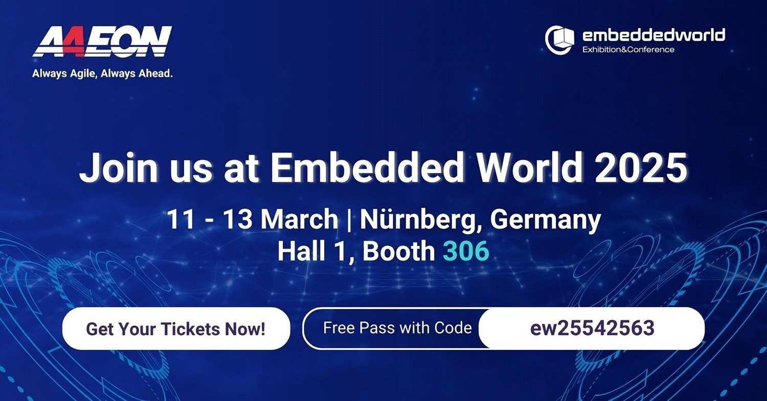 敬請務必使用代碼ew25542563免費入場,參觀於2025年3月11日至13日的德國嵌入式電子與工業電腦應用展,並蒞臨1號展館306號攤位,親身體驗研揚科技的創新科技。